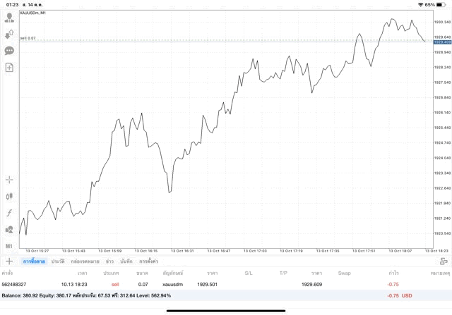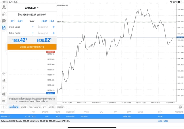 การเทรด ทองคำ 0.07 lot จะเริ่มขึ้นแล้ว หลังจากนักลงทุนกรอกจำนวน lot ที่ต้องการเทรด แล้วคลิ๊กปุ่ม Sell by market หรือ Buy by market การเทรดจะเริ่มขึ้น