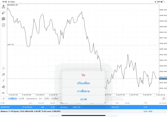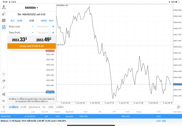 คลิ๊กปุ่มสีส้ม Close with profit +6.53 ราคาเปลี่ยนแปลงผลกำไรขาดทุนยังเปลี่ยนแปลง
