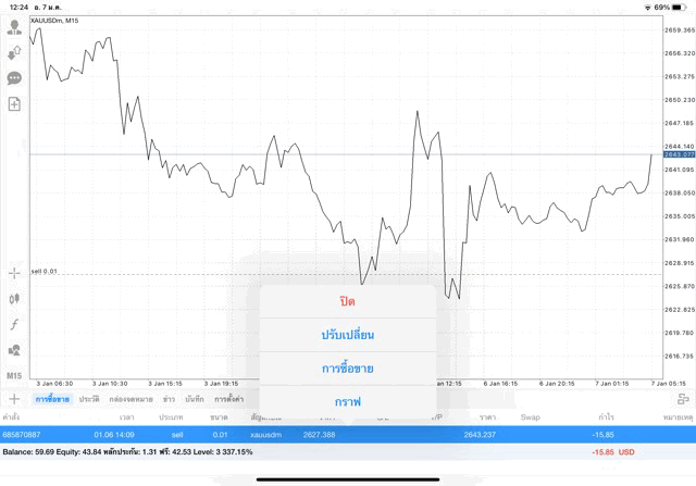 คลิ๊กปุ่มสีส้ม Close with loss -15.84 ราคาเปลี่ยนแปลงผลกำไรขาดทุนยังเปลี่ยนแปลง