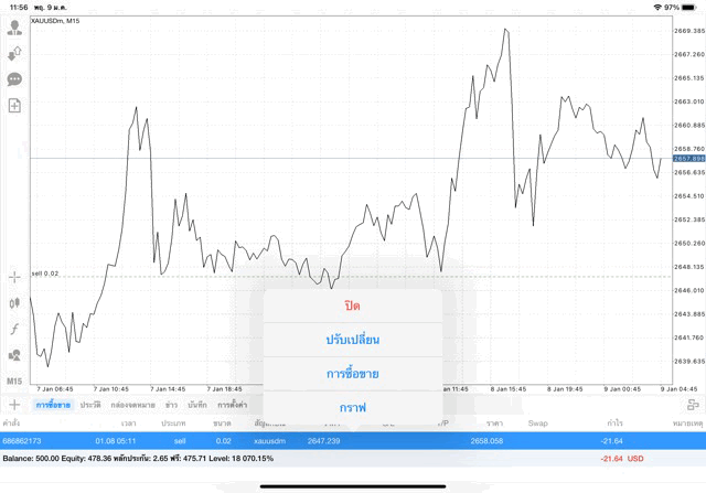 คลิ๊กปุ่มสีส้ม Close with loss -21.61 ราคาเปลี่ยนแปลงผลกำไรขาดทุนยังเปลี่ยนแปลง